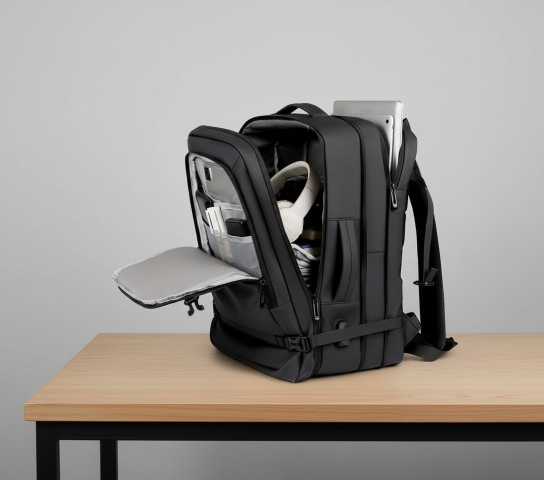 A smart, roomy backpack designed for work, school, and travel. Starts at a slim 22 cm and expands to 28 cm when you need extra space. Perfect for professionals, students, and learners who want organized storage for books, gadgets, and travel essentials.
