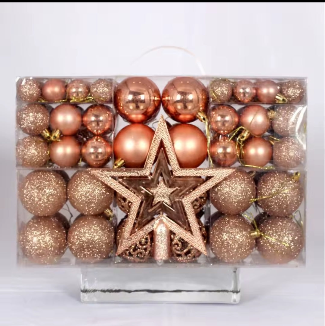 It includes 6cm (32pcs), 4cm (36pcs), and 3cm (32pcs) ornament balls plus one elegant star topper.
