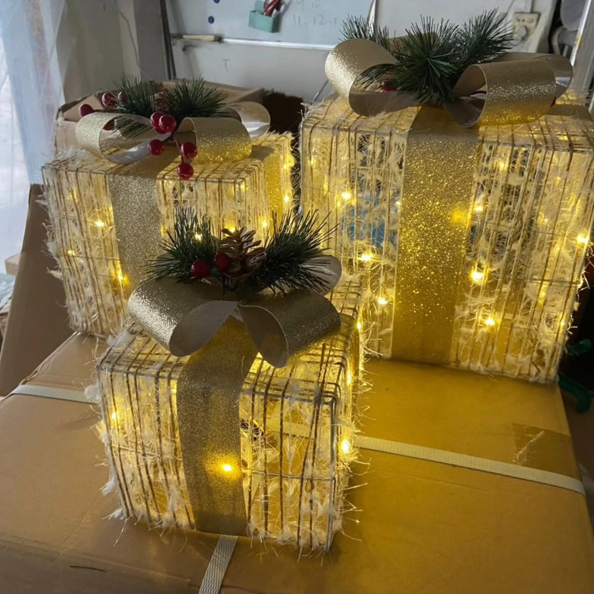 3Pc Set Snow Flocked Christmas Lighted Gift Boxes (Design B)