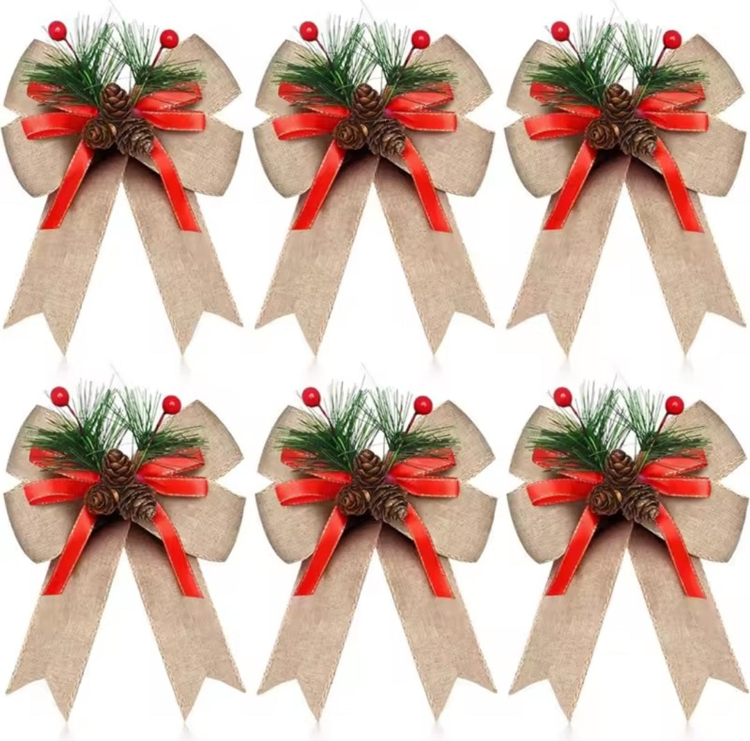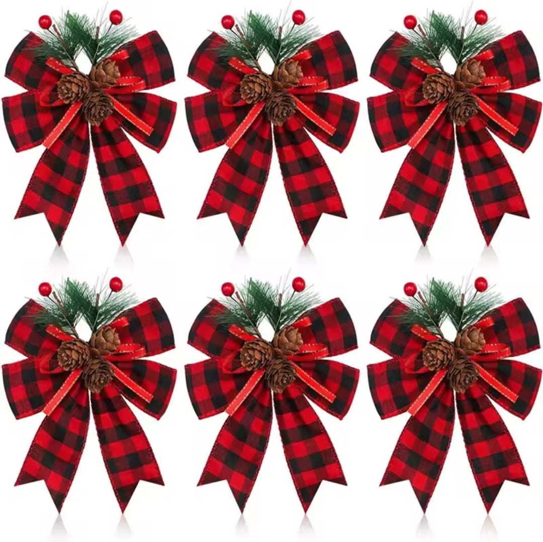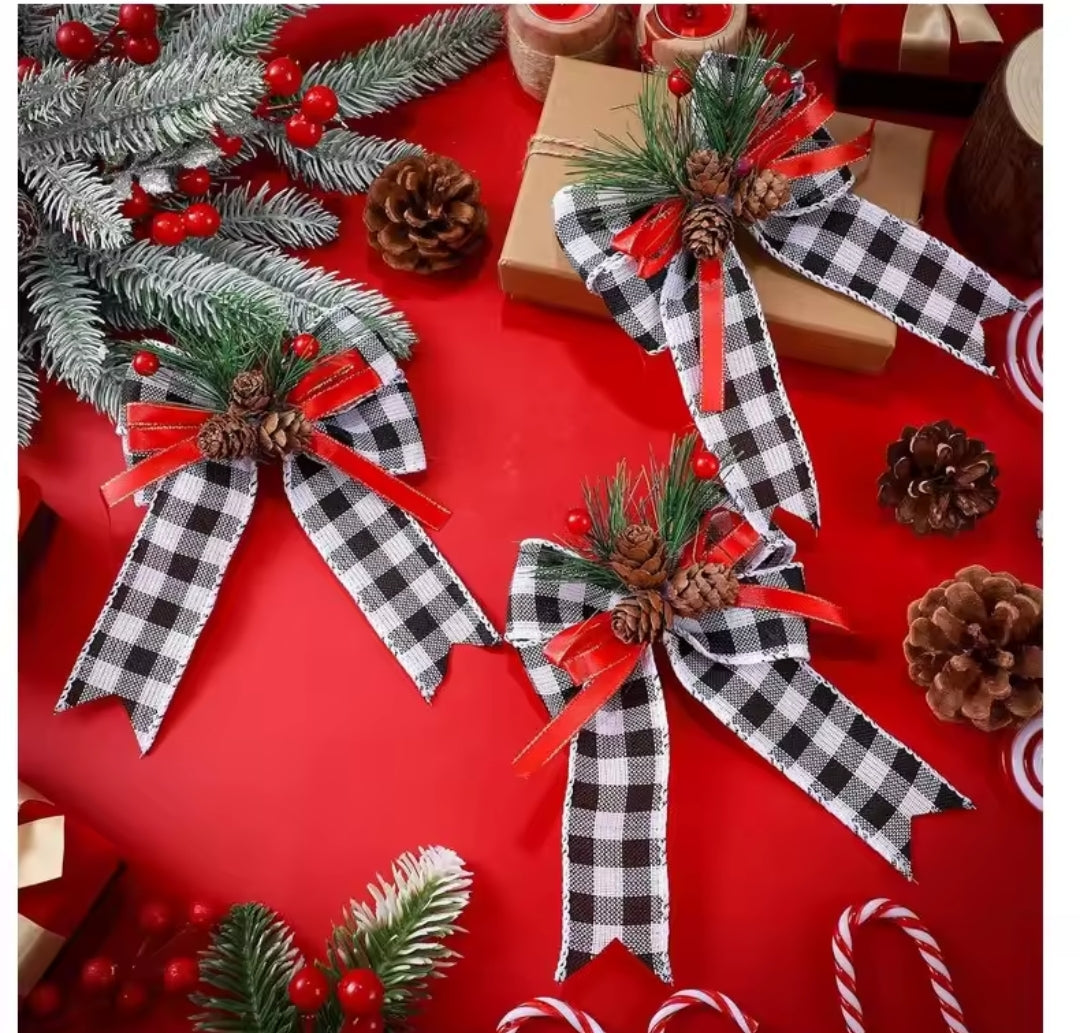 Add a festive touch to your décor with this Christmas checkered ribbon bow featuring realistic pine cones.