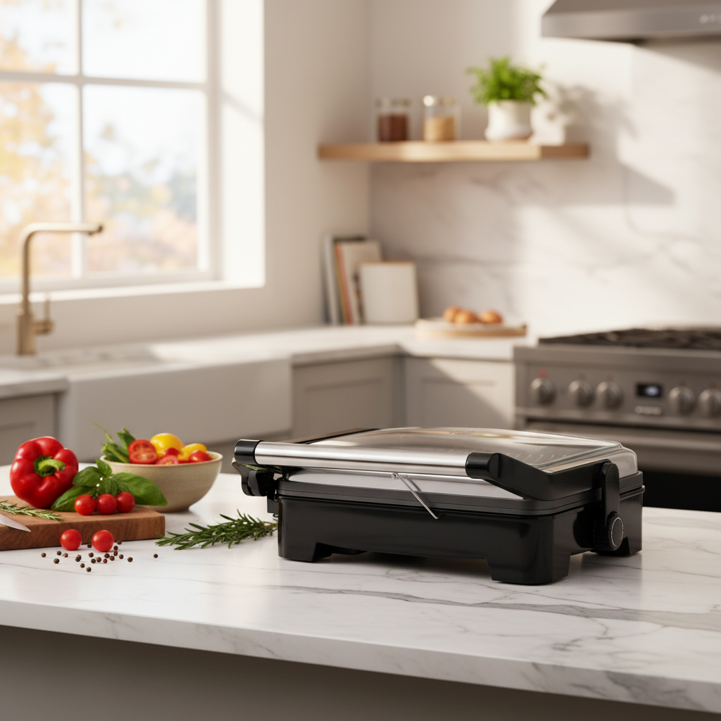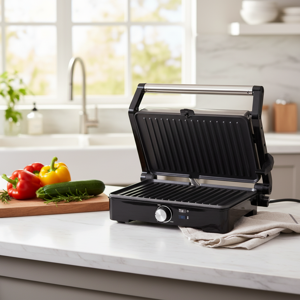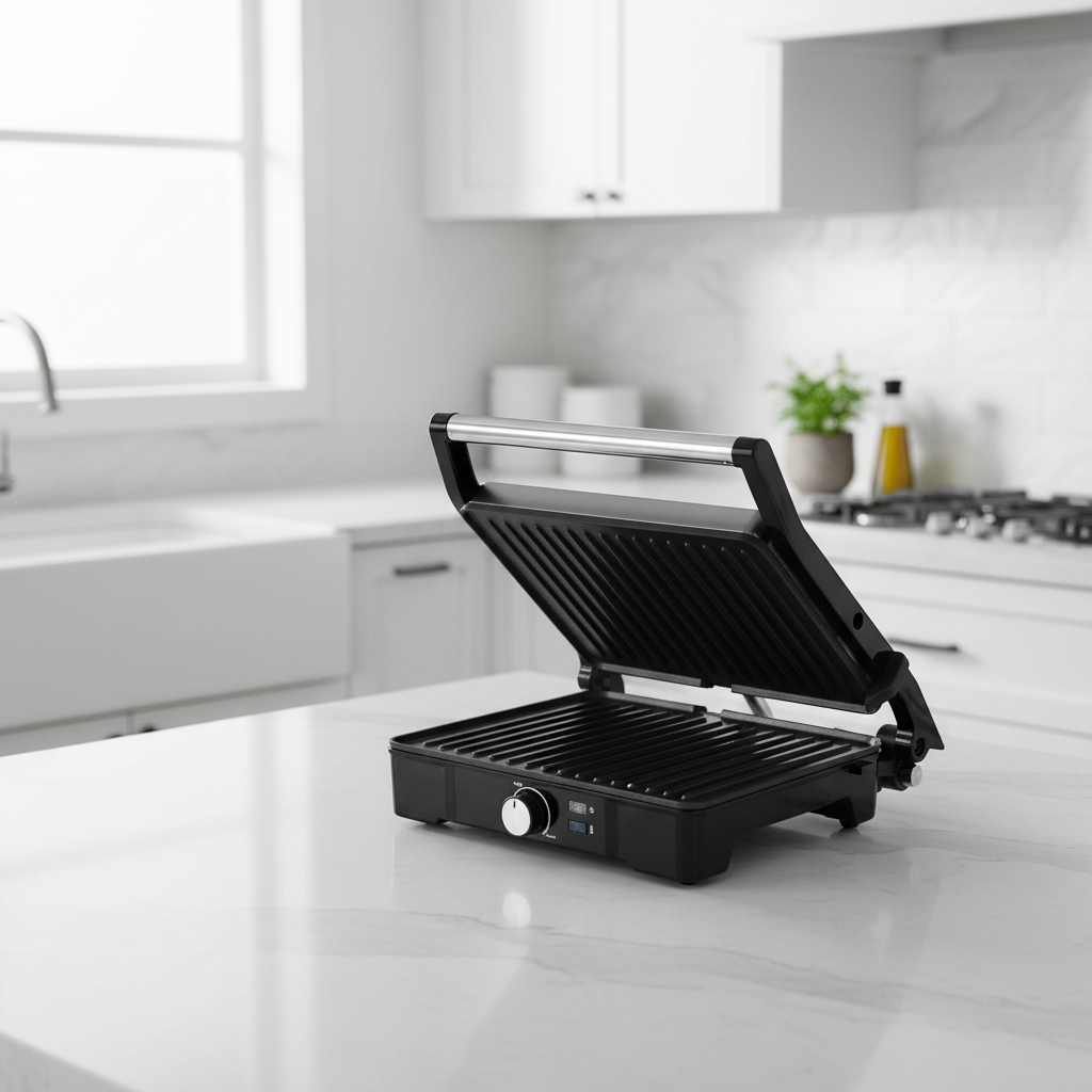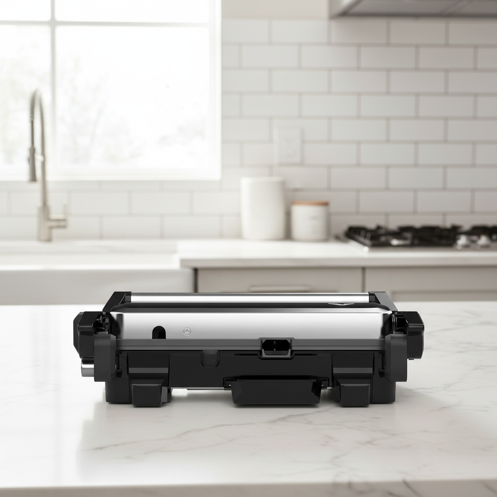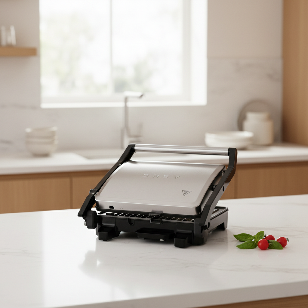 The AENO EG2 Electric Grill is a versatile 2000W grill designed for healthy and convenient cooking at home. Its 180° opening allows you to cook on both plates simultaneously, while the non-stick ridged plates ensure easy cooking and cleaning. Adjustable temperature settings from 170°C up to 230°C provide precise control for grilling meats, vegetables, sandwiches, and more. Complete with an oil drip tray, anti-slip feet, and a digital recipe guide, this grill is ideal for effortless, mess-free cooking.