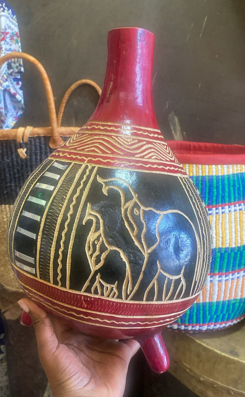 This handcrafted African calabash with a striking red neck and matching stand beautifully blends tradition with elegance. Made from natural gourd, it showcases authentic African artistry and craftsmanship. The stand adds stability and style, making it a perfect decorative accent or functional serving vessel for traditional drinks.