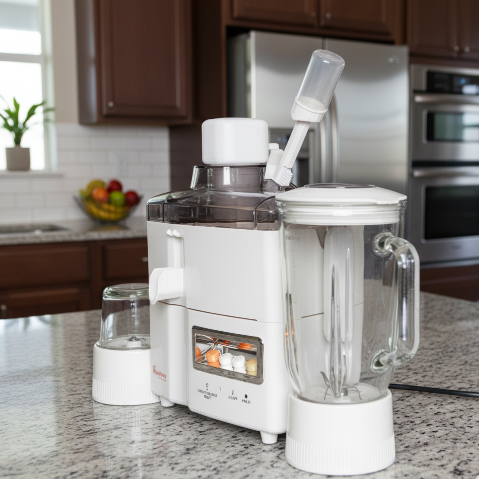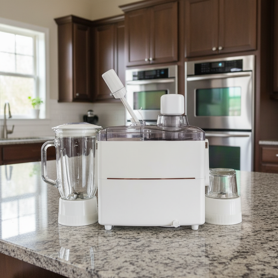 • 3-in-1 design: juicer, blender, and grinder
