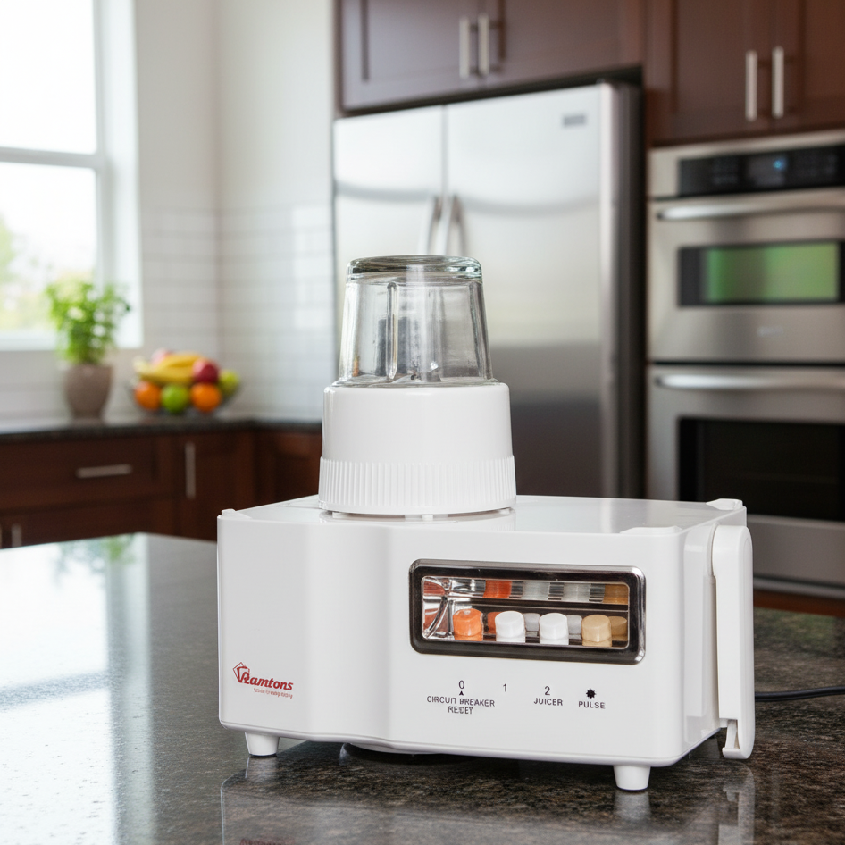 Enjoy freshly made juices, smoothies, and blends right from your kitchen with this 3-in-1 Ramtons Juicer. Designed for everyday use, it combines a powerful juicer, blender, and grinder in one compact unit. Its stainless steel spinner efficiently extracts juice from fruits and vegetables, while the blender and grinder attachments handle everything from smoothies to spices. With a 500-watt motor and durable build, this appliance makes healthy living simple and efficient.