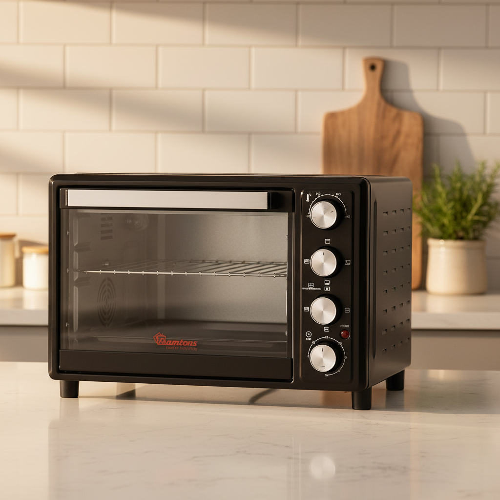Upgrade your kitchen with the Ramtons 32L Oven Toaster with Convection. Designed for both elegance and performance, this sleek black toaster oven delivers precise and even cooking with its 1600W heating system and stainless steel heating elements. The oven features adjustable temperature controls, a movable bake rack, and an enamelled bake tray to suit all your baking and roasting needs. Additionally, the built-in rotisserie function allows you to prepare succulent roasted meals effortlessly. Perfect for family meals or gourmet cooking, this oven toaster combines versatility, style, and convenience.