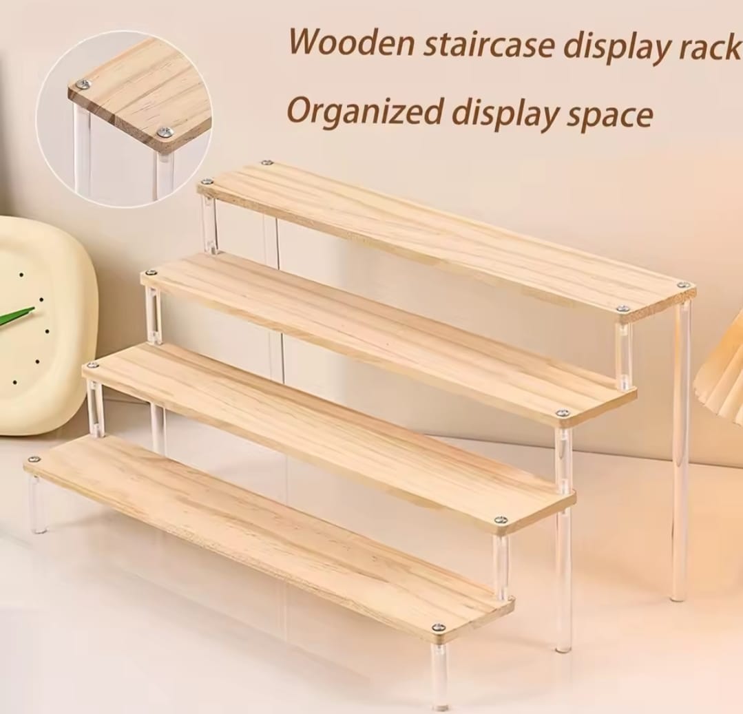 Organize your beauty collection in style with this 4-tier display stand. Featuring natural wood shelves and clear acrylic legs, it’s perfect for showcasing perfumes, skincare products, or cosmetics while keeping your vanity neat and elegant.