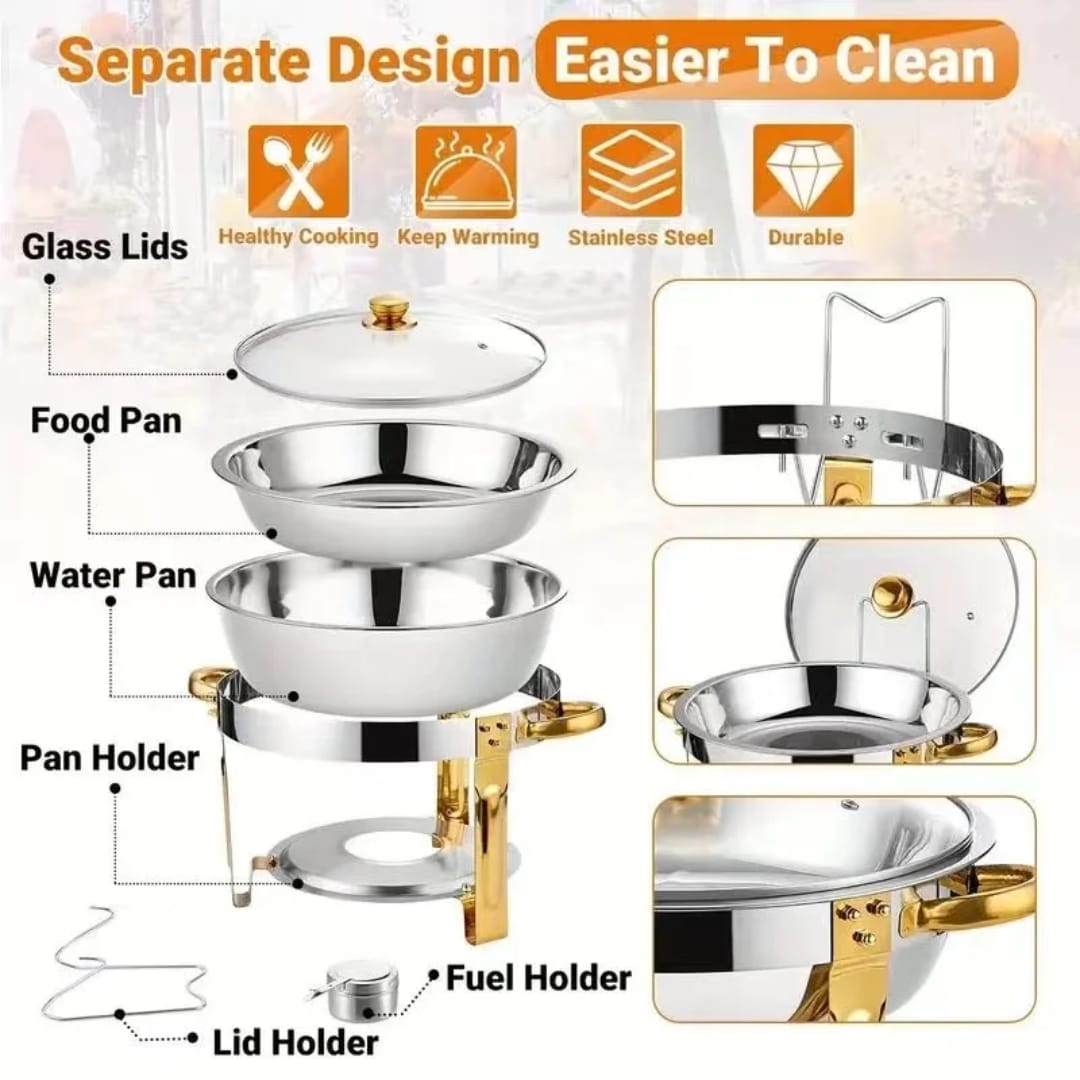 Serve in style with this Elegant Round Stainless Steel Chafing Dish featuring stunning gold-plated handles and legs. Designed to keep your meals hot and fresh for hours, it’s perfect for buffets, home gatherings, and professional catering.