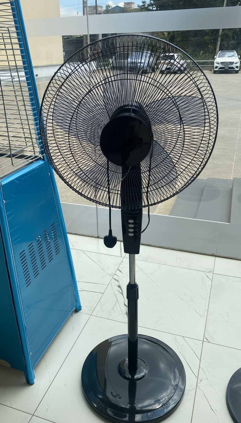 Cool your space effortlessly with the black stand fan with remote RM/757. Built for performance and convenience, it delivers strong, steady airflow with three adjustable speeds and 90° oscillation for full-room coverage. The included remote control lets you change settings without leaving your seat, while its 18-inch blades and 70W motor provide powerful yet energy-efficient cooling.
