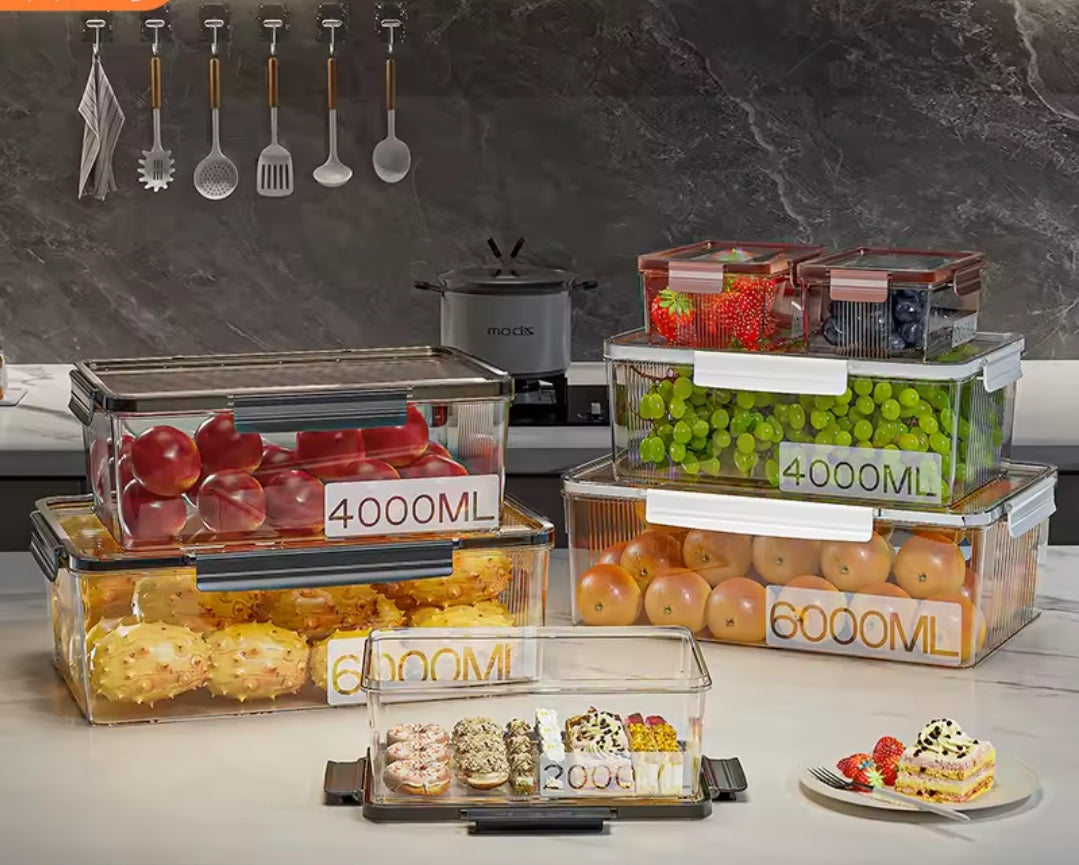 Airtight and leak-proof food storage set with sizes 6L, 4L, 2L, 1L and 500ml.
