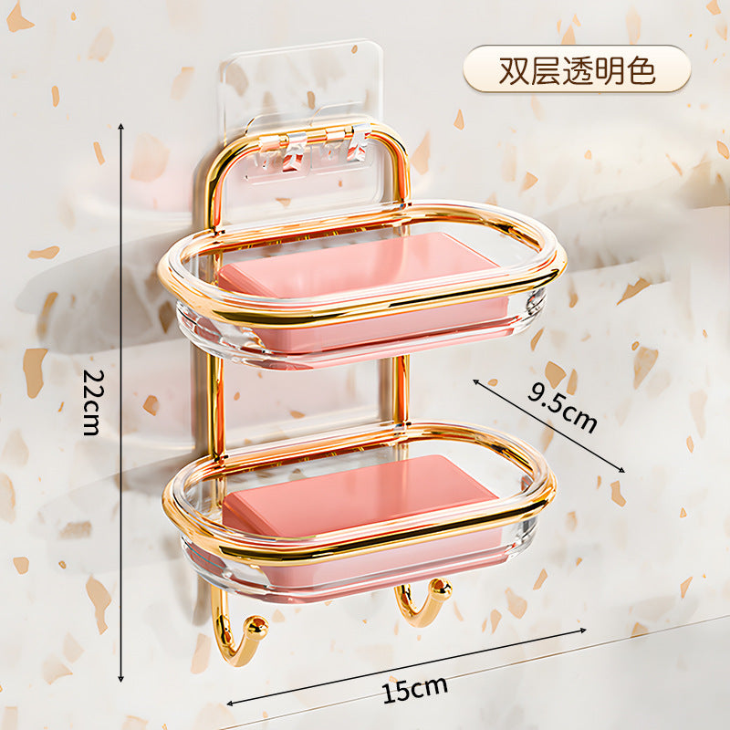 Upgrade your bathroom with this stylish double-layer gold-plated soap holder. Featuring a drainage design and strong adhesive backing, it keeps your soaps dry while providing extra storage for a neat and elegant bathroom setup.