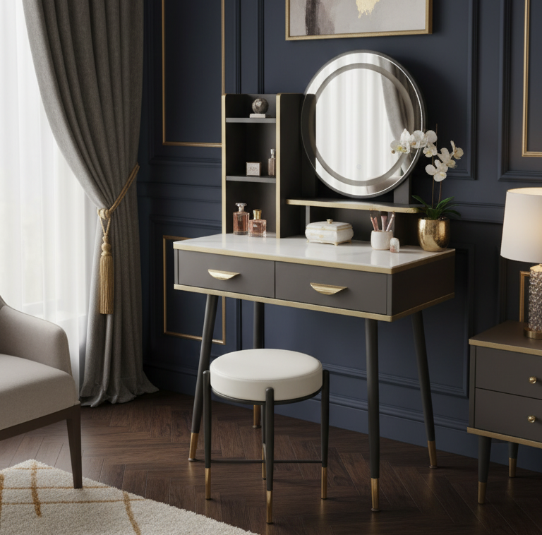 - Smooth tabletop for cosmetics, mirrors & accessories