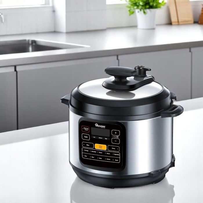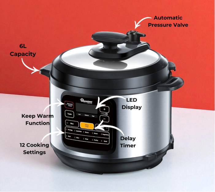 Simplify your cooking with the Ramtons Electric Pressure Cooker, a versatile kitchen essential designed to prepare your favorite meals quickly and efficiently. Featuring 12 cooking settings, this multi-functional appliance allows you to cook everything from rice and beans to stews and meats with ease. Its 6-litre capacity makes it perfect for family meals, while the stainless steel housing ensures durability and long-lasting performance. With a 24-hour preset timer, you can plan your meals in advance, and the 4-digit LED display provides clear, easy-to-read controls. Equipped with 9 safety guards and a pressure indicator, this pressure cooker combines convenience, precision, and safety for hassle-free cooking.