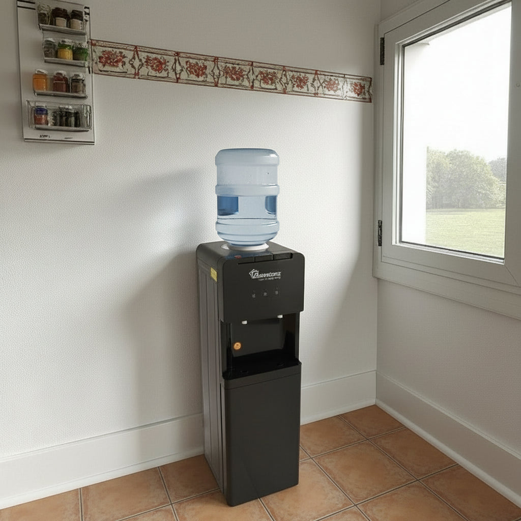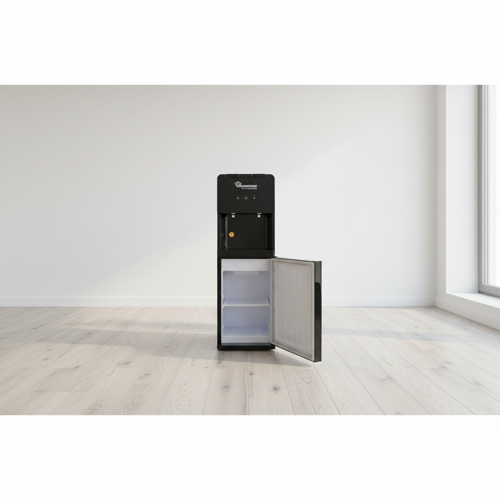 Experience the perfect blend of style, safety, and convenience with this sleek black hot and normal water dispenser. Designed for modern homes and offices, it provides quick access to both hot and room temperature water through its top-loading feature. The stainless steel hot tank ensures efficient heating, while built-in overheat protection and a child lock guarantee safe operation. For added practicality, a storage cabinet keeps essentials close at hand, making this dispenser both elegant and functional.