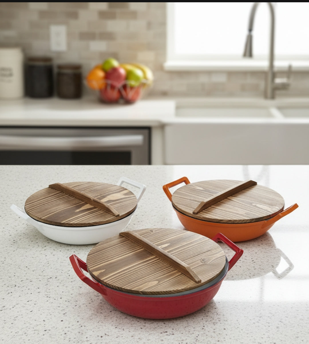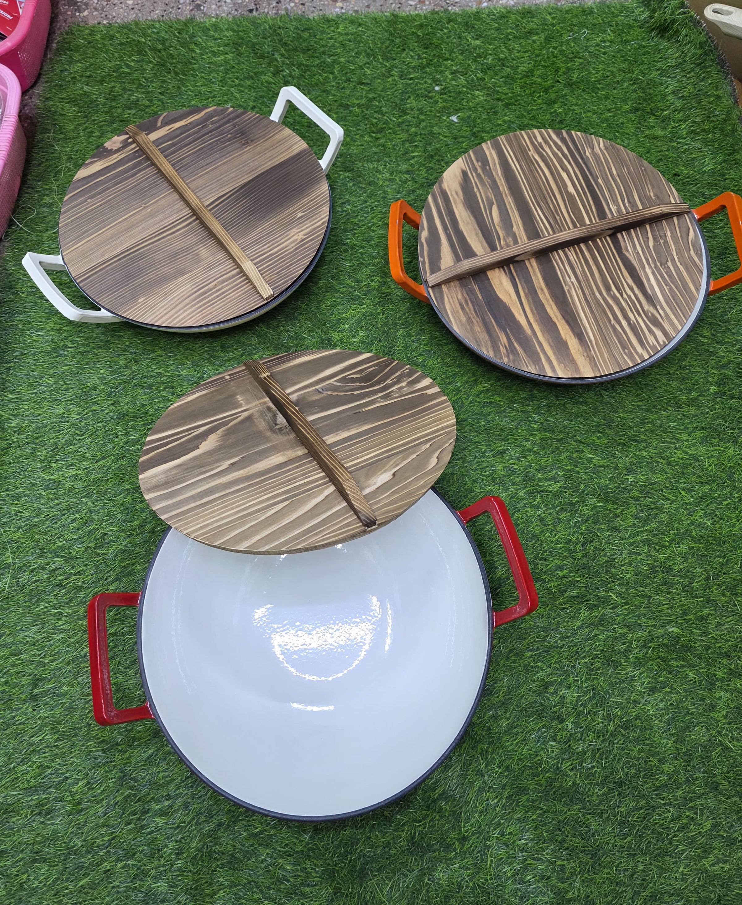 Upgrade your kitchen with this premium 36cm non-stick enameled cast iron wok pan, complete with a stylish wooden lid. Perfect for stir-frying, braising, steaming, or deep-frying it distributes heat evenly and locks in rich flavors. Available in Red, White, and Orange at K get yours today and enjoy restaurant-quality cooking at home!