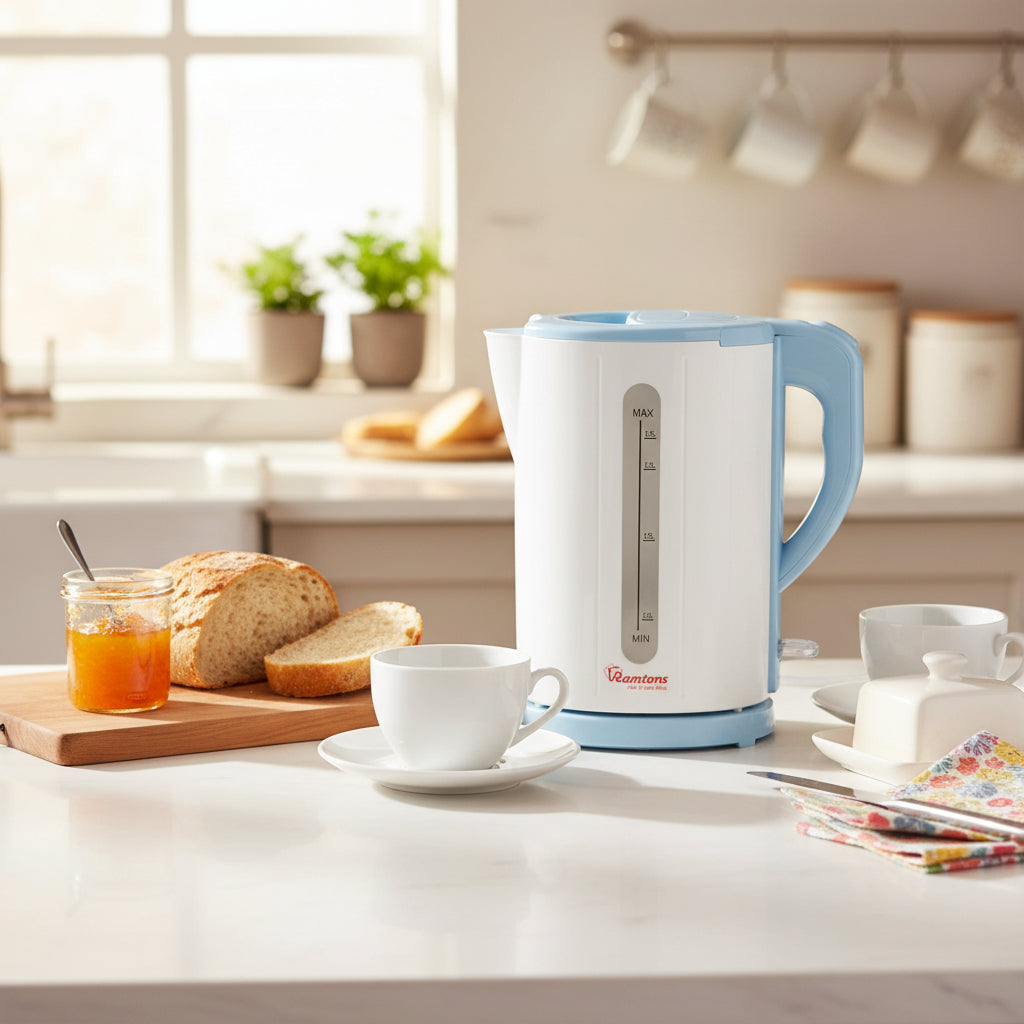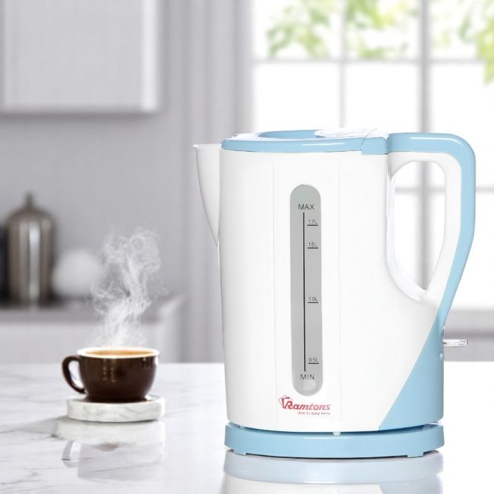 Bring speed, safety, and style to your kitchen with this Ramtons cordless electric kettle, designed for everyday convenience at an affordable price. With a generous 1.7 liter capacity, it is perfect for busy households that need hot water quickly for tea, coffee, or cooking. The powerful 2200 watt concealed heating element ensures fast boiling, while the dry boil protection automatically switches off the kettle to prevent damage when there is no water inside. Finished in a clean white and blue design, this kettle combines practicality with a modern look.
