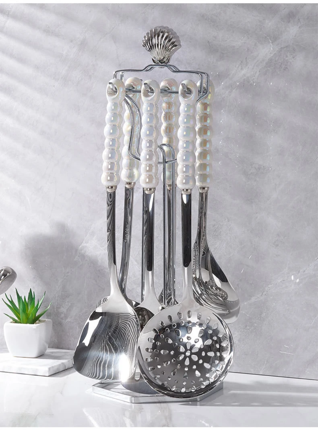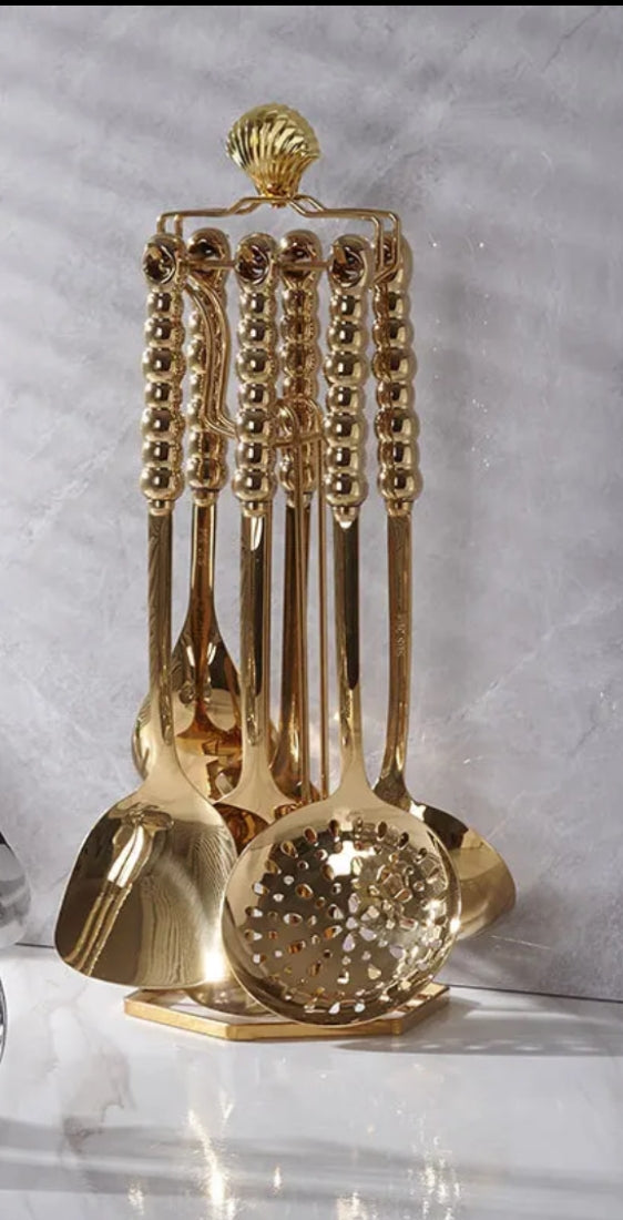 Ceramic Handle Nordic & Stainless Steel Serving Spoon Set 7in1 in pcs Available in WHITE, BLACK AND GOLD