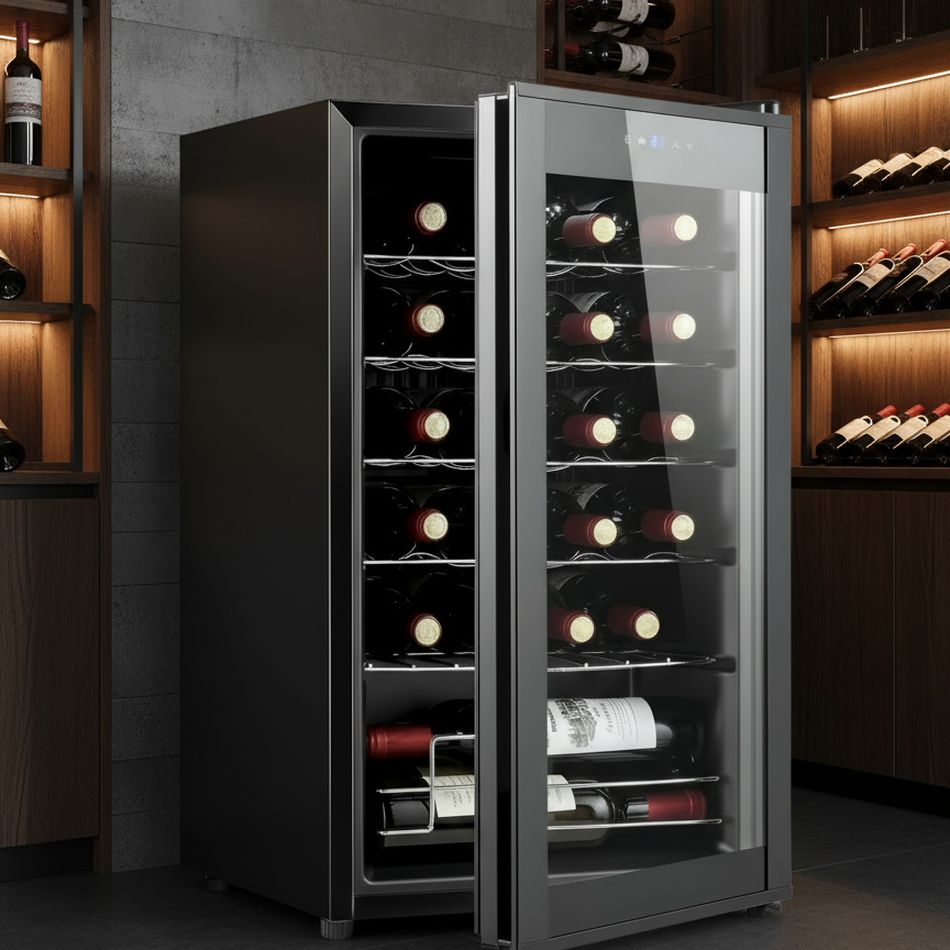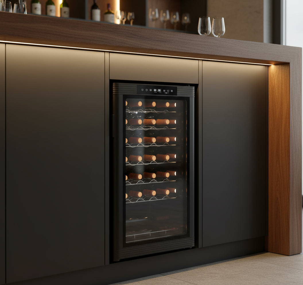 Preserve every bottle in perfect condition with the Under Counter Wine Chiller 33 Bottle RF/449. Designed for wine enthusiasts, this 95-liter cooler stores up to 33 bottles and maintains an ideal temperature range between 5°C and 18°C — perfect for both red and white wines. Its compressor air cooling system ensures consistent performance, while the chrome-plated wire shelves add a touch of sophistication. Energy-efficient, quiet, and eco-friendly, it’s the perfect blend of function and elegance for your home, restaurant, or bar.