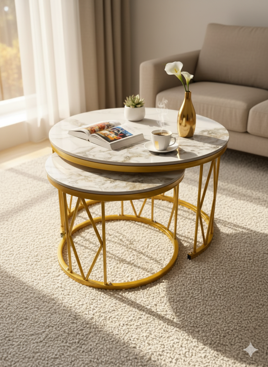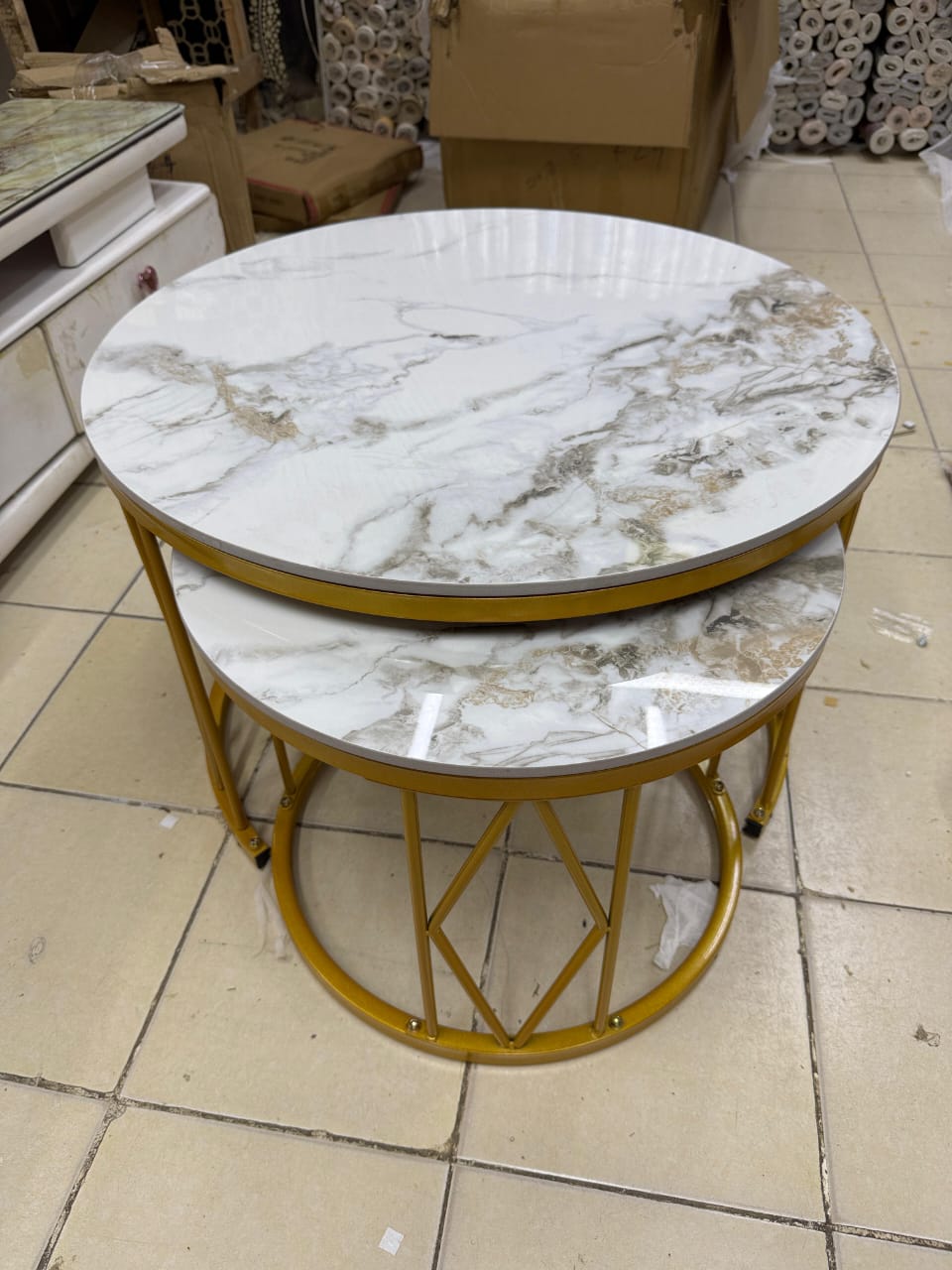Bring style and sophistication to your living space with this 2in1 marble nesting coffee table set. Designed with elegant gold metallic stands and smooth marble tops, these tables add a touch of class while offering practical functionality. Perfect for modern homes and lounges.