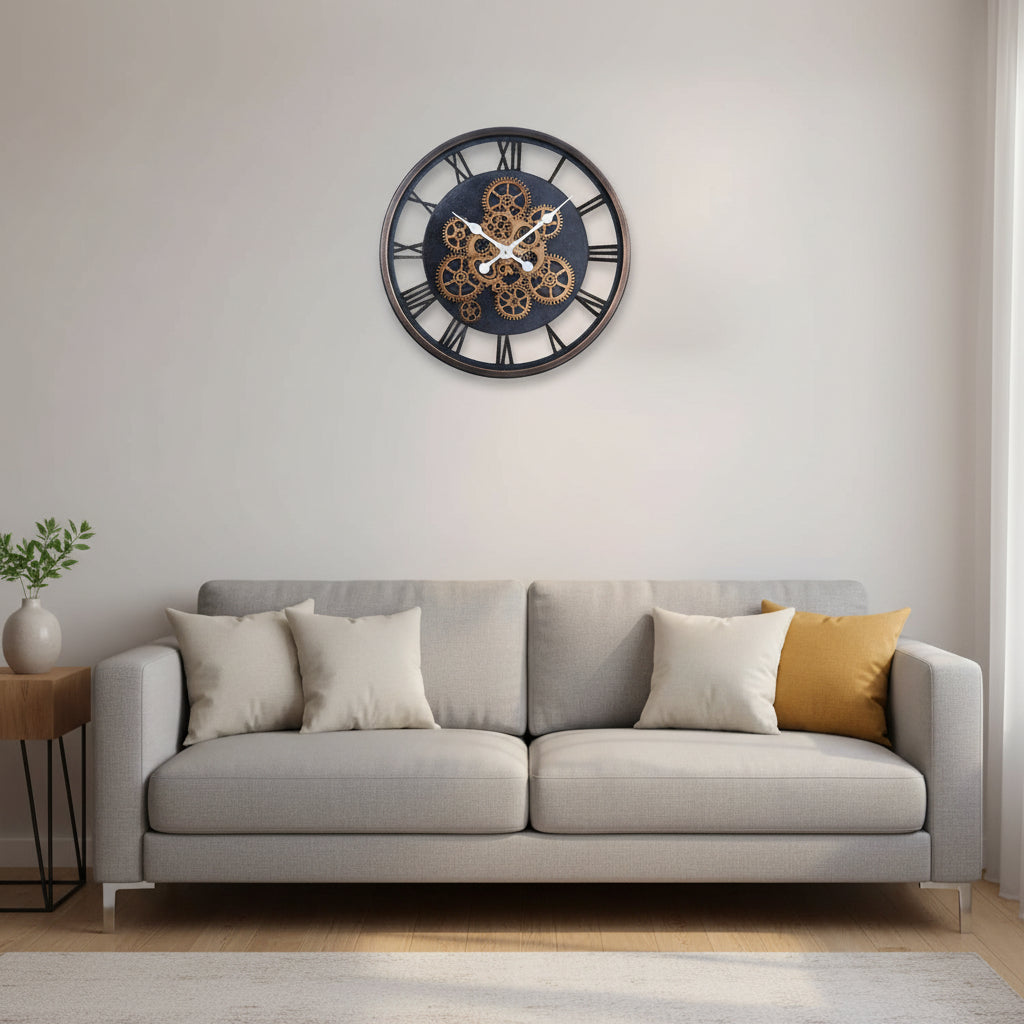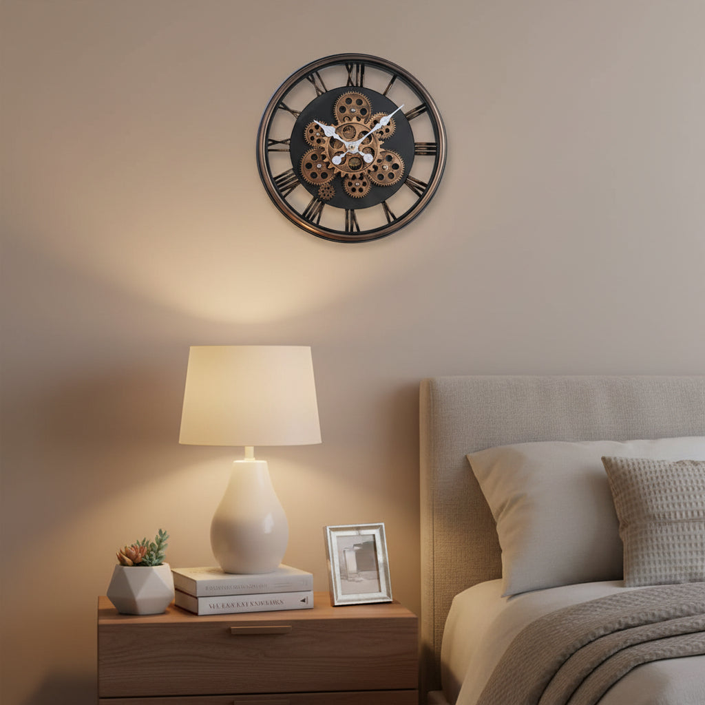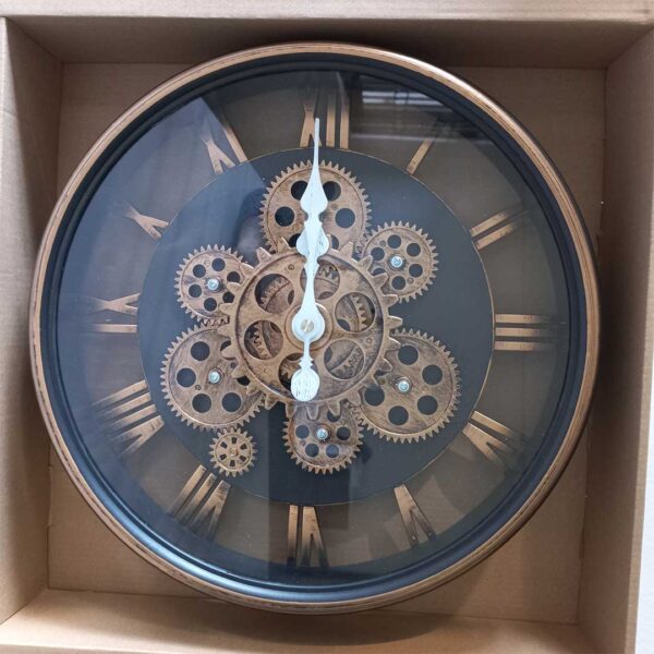 Elevate your interior with the 37.5cm Rose Gold Gear Wall Clock, a striking combination of industrial design and vintage elegance. Featuring an open-face layout with exposed gear details and classic Roman numerals, this wall clock brings both functionality and decorative appeal to living rooms, offices, cafés, or boutique spaces. The warm rose gold and black finish adds sophistication while making a bold style statement. Battery-operated for easy installation and hassle-free operation.