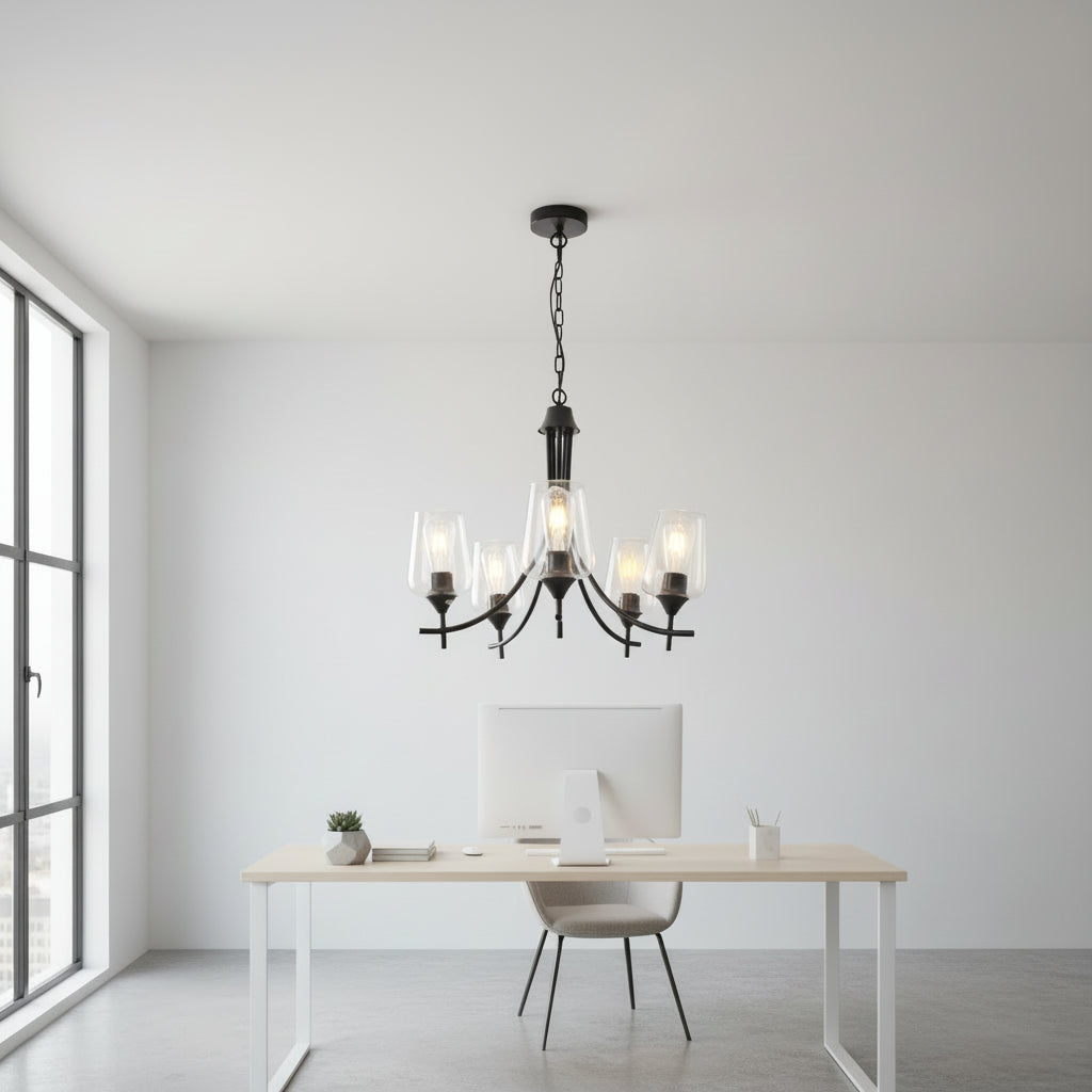 Make a statement with this Black Chandelier Lamp, featuring five E27 sockets, clear glass shades, and sleek curved iron arms. This bold, industrial-style fixture delivers brilliant illumination while adding modern charm to dining rooms, living areas, bedrooms, and commercial spaces. Its contemporary design combines functionality and style, creating a striking focal point in any interior.