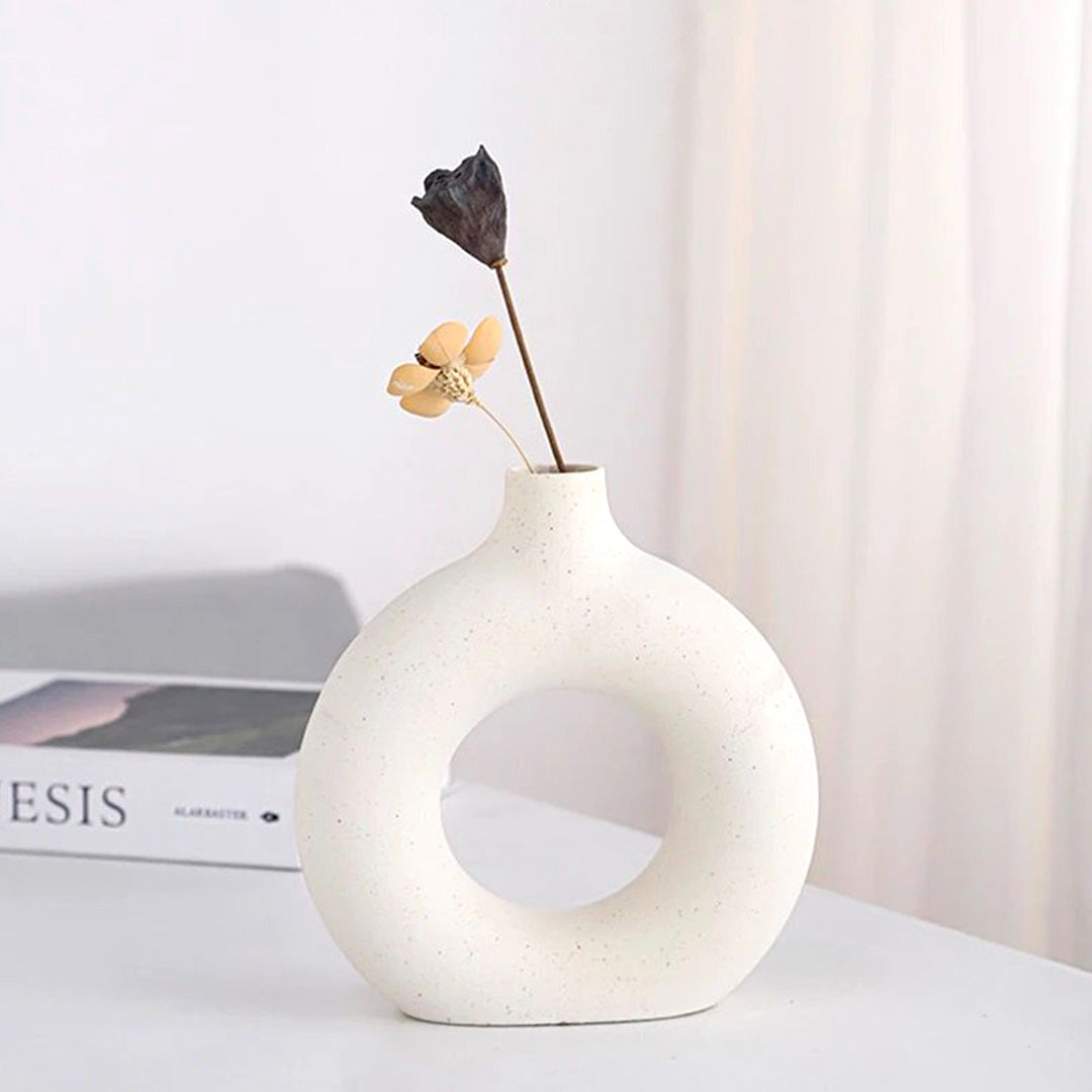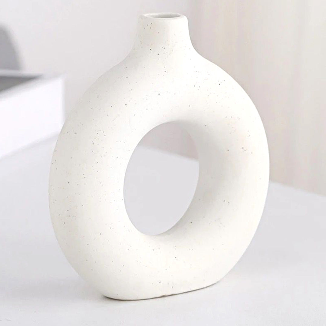 levate your interior with the modern elegance of this Ceramic Ring Vase. Its unique circular cutout design adds a contemporary touch, making it perfect for displaying dried flowers, pampas grass, or even standing alone as a statement piece. Crafted from matte ceramic with a subtle speckled finish, this vase complements minimalist, modern, and versatile décor styles. Available in three sizes, it suits a variety of spaces, from tabletops to shelves and entryways.