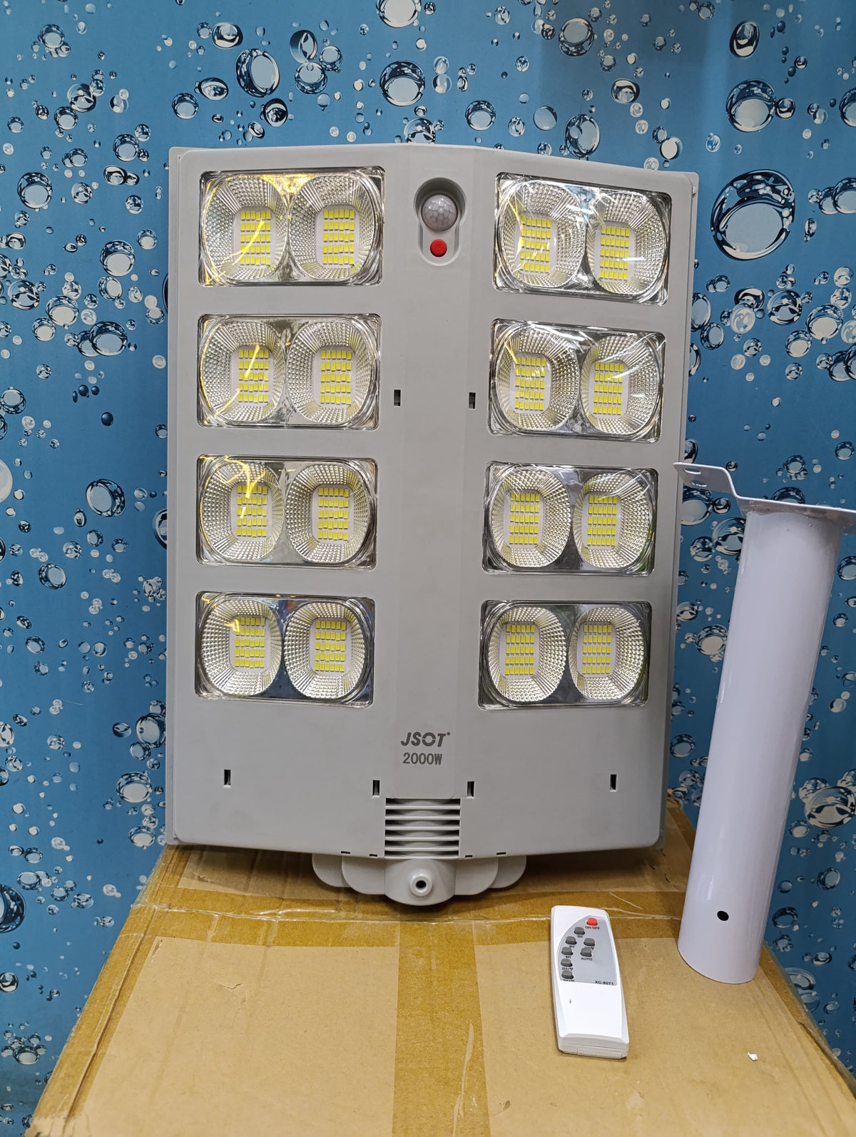 2000W solar street light designed for efficient outdoor illumination. Its high-power output provides bright and reliable lighting for streets, roads, parking lots, and public areas. The grey finish offers a modern, neutral look, and its durable, weather-resistant construction ensures long-lasting performance in various outdoor conditions.