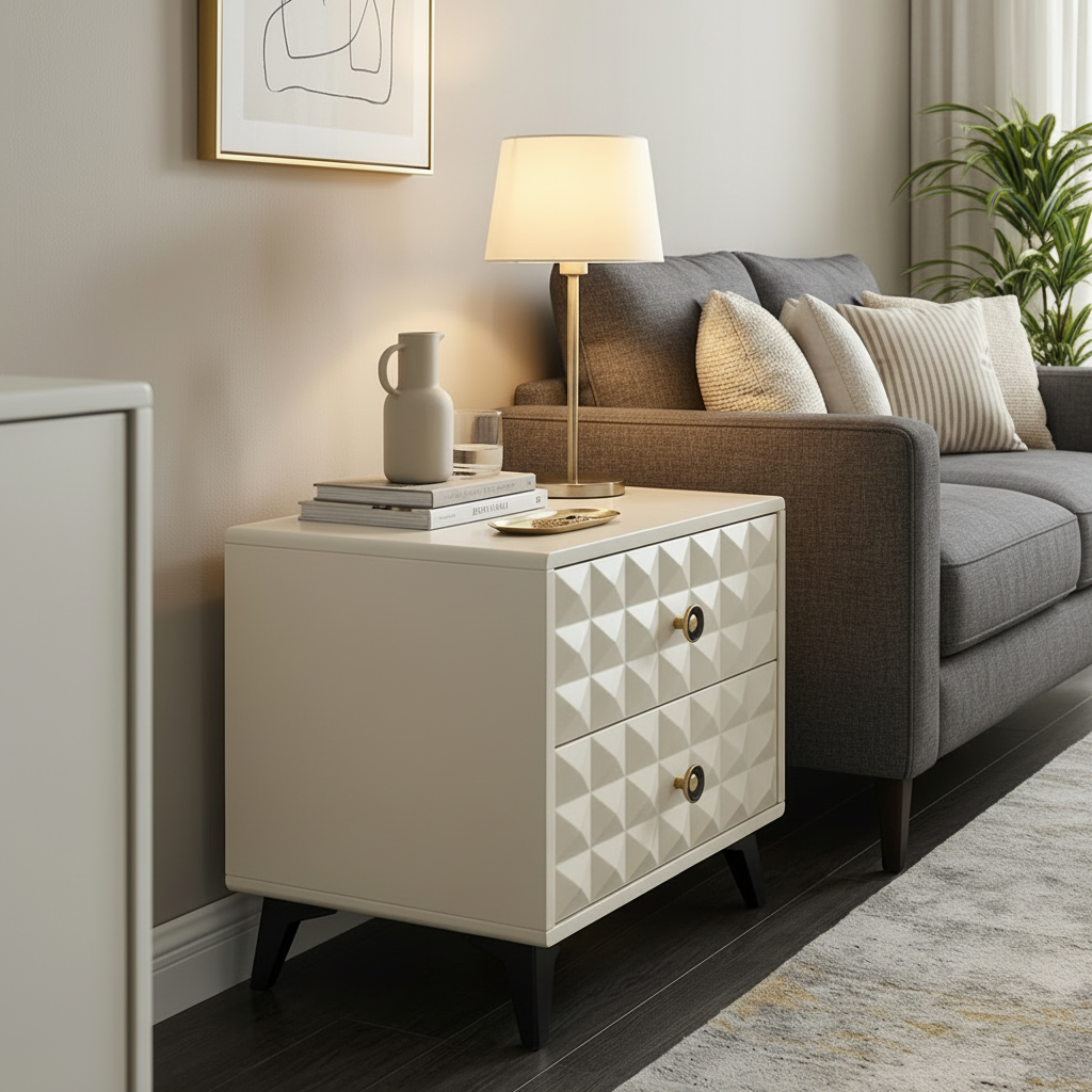 Upgrade your bedroom with this stylish two drawer bedside cabinet designed with elegant fluted panel detailing on the drawer fronts. Finished in a clean white tone, it brings a fresh and refined look that blends easily with a variety of interior styles. The minimalist hardware enhances its clean aesthetic while maintaining ease of use. Compact yet functional, this nightstand provides practical storage for bedside essentials, helping keep your space neat, organized, and visually appealing.