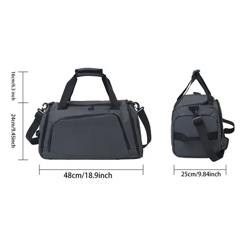 Waterproof duffel bag designed for travel, gym, and outdoor use. Features a spacious main compartment and a separate shoe compartment to keep items organized. The convertible design allows it to be carried as a duffel or worn as a backpack, offering flexibility for different uses.