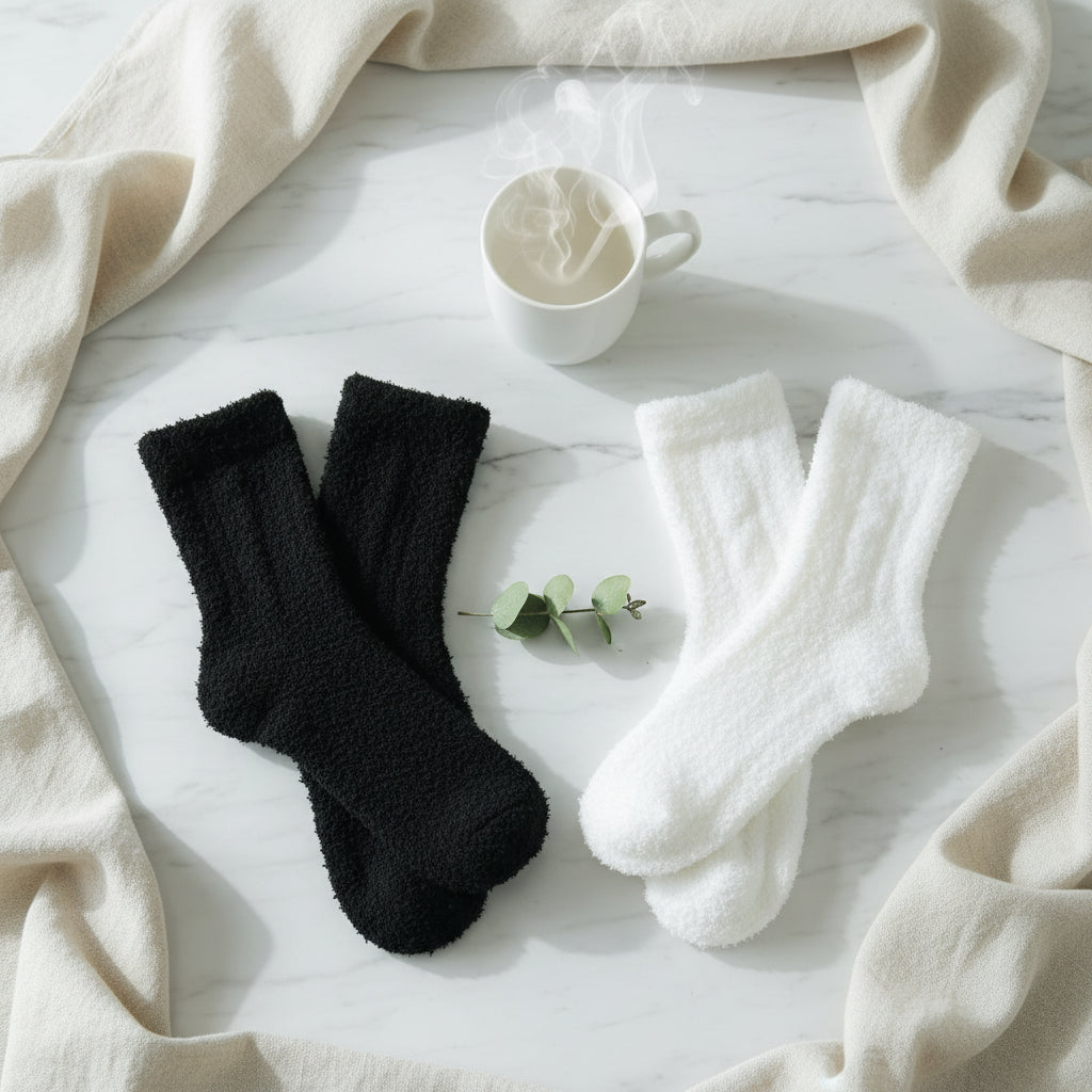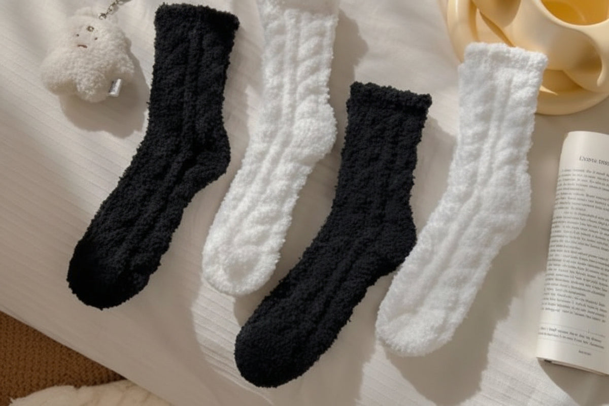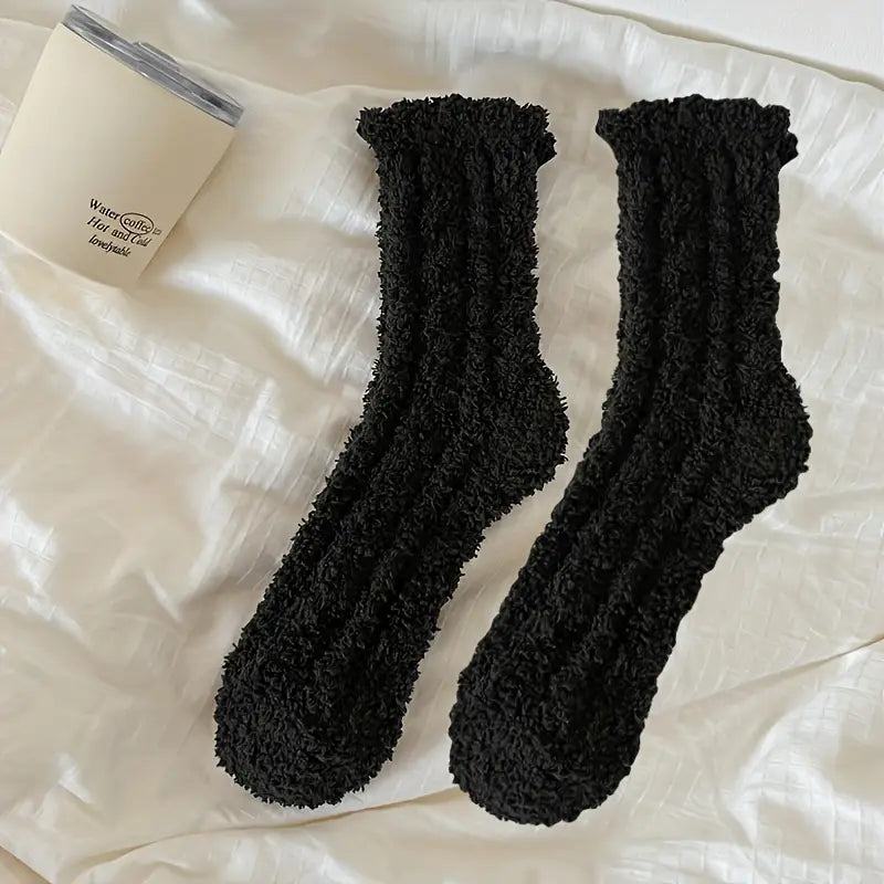 Women’s winter fleece fuzzy socks designed for warmth and comfort. Featuring a middle-tube length and soft, thick material, these socks are perfect for home use during autumn and winter. Available in black and white, they combine coziness with a playful, happy design.