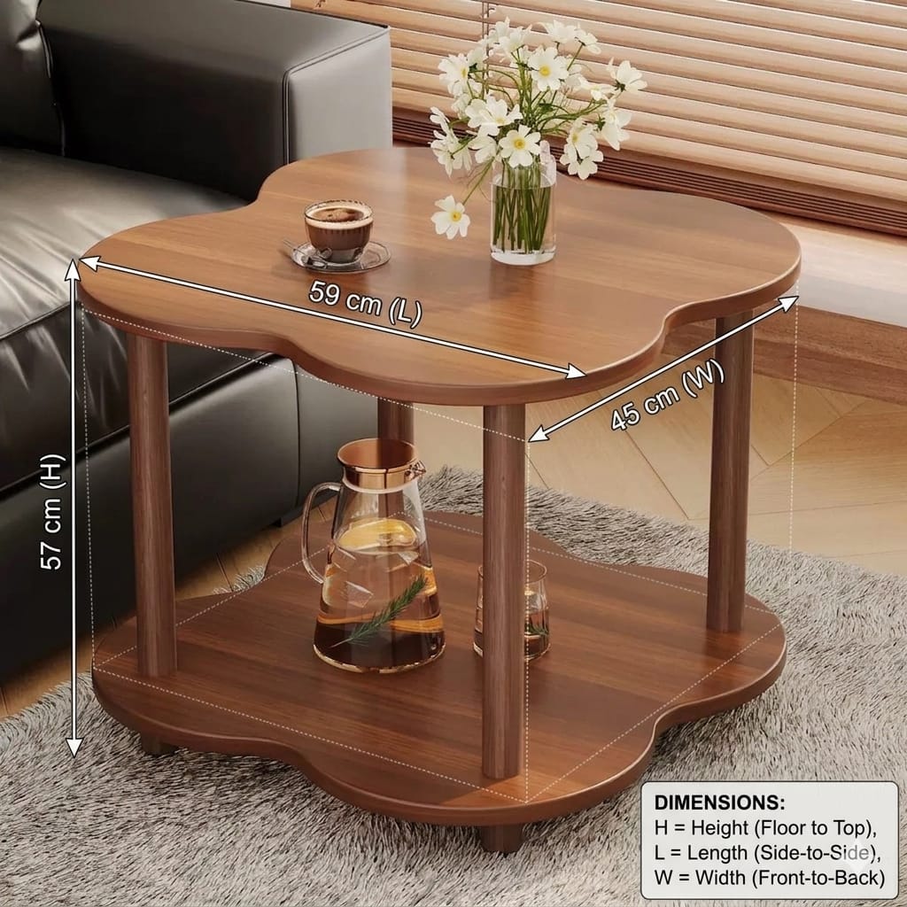 Elevate your living space with this modern wooden flower-shaped side table. Its unique vintage design doubles as a coffee table or nightstand, perfect for small spaces and minimalist interiors. Crafted from durable wood, it provides both style and practicality, offering storage for books, décor, or everyday essentials. Measuring 59 cm (L) × 45 cm (W) × 57 cm (H), it fits seamlessly into any living room, bedroom, or cozy corner.